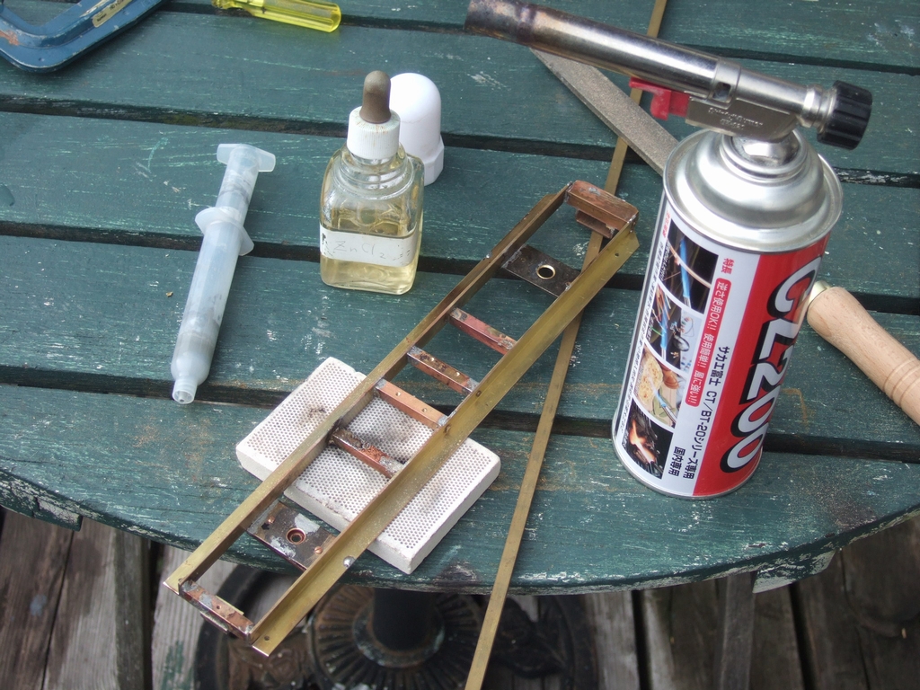ブラスの3/8インチのアングルと1/4インチ角棒を切ってあぶり付けである。今回はペイスト状のハンダを用いた。永末氏から分けて戴いたもので、プリント基板につけて部品を置いてオヴンに入れる方式の特殊ハンダである。ボディ・ボルスタは1.5 mm厚である。絶縁は2 mmベークライトを用いた。この液状ハンダは永末氏の工場での賞味期限切れのものであるが、模型工作にはなんら差し支えなく使える。注射器のようなものに入っている。先端を切り落として押し出す。