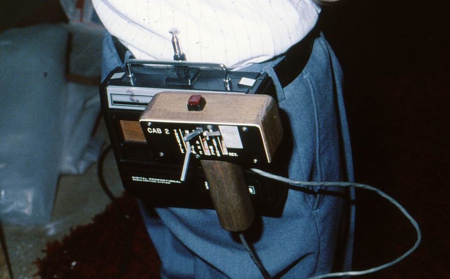 ディックはずいぶん昔からウォーク・アラウンドを採用していた。DCCが生まれる前からである。ラジコンの送信機を腰に付け、そのポテンシオ・メータを外部に取り出し、ハンドヘルドのキャブを作った。路盤高さは48インチ(122cm)で筆者のと同じである。