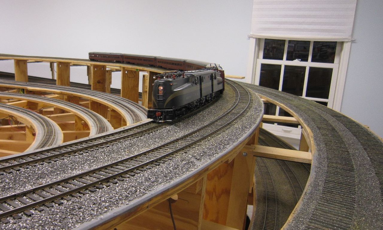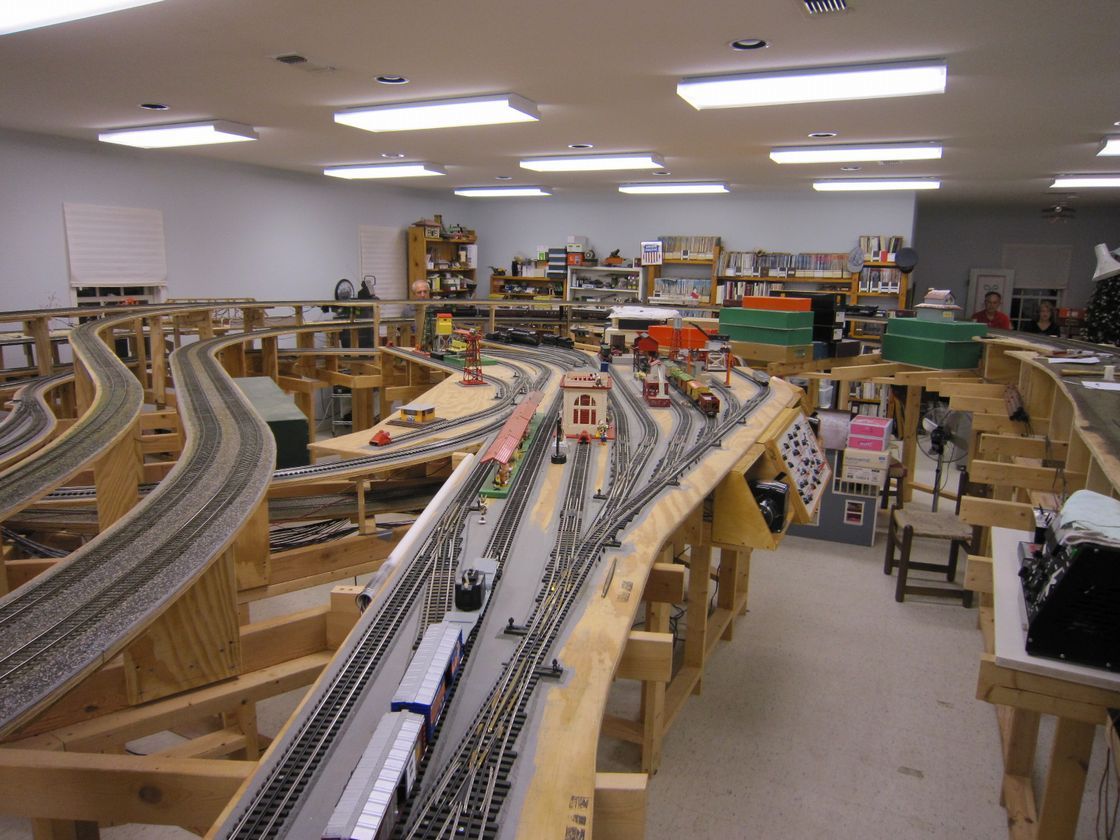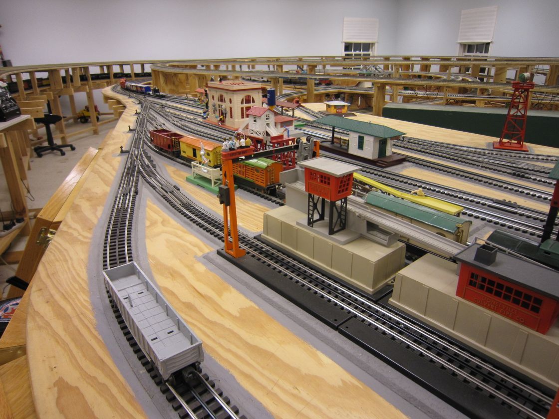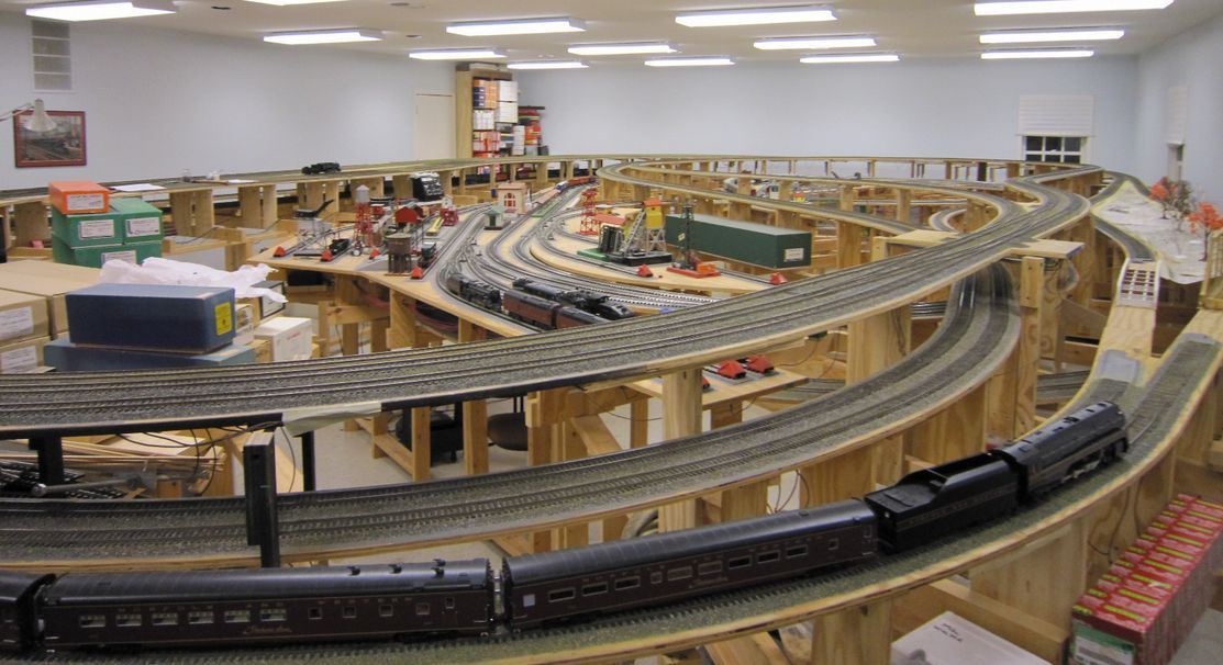 その2階は70坪ほどの柱の無い空間である。とにかく広い。その中心部にライオネルのレイアウトを置き、周りをOスケールが走っている。このレイアウトの設定は都市部の複線区間である。