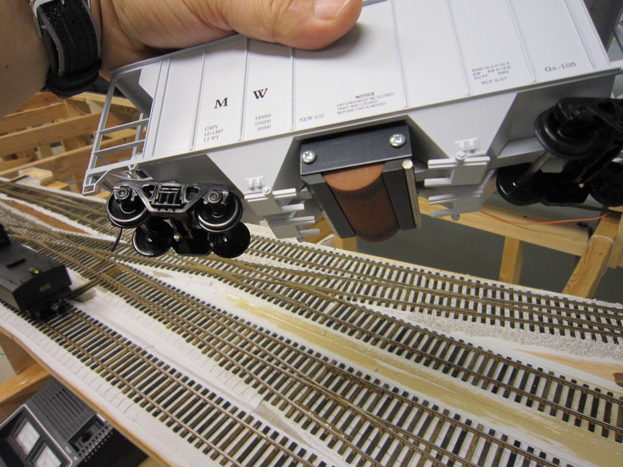 これはレイル磨き用の専用車である。砂の入ったゴムローラは滑らかではない廻り方で回転する。滑らかに廻ればそれは意味がない。ある程度つんのめりながら廻る方が摩擦が多くて良い。丸棒は磁石で、鉄片を集めることが出来る。