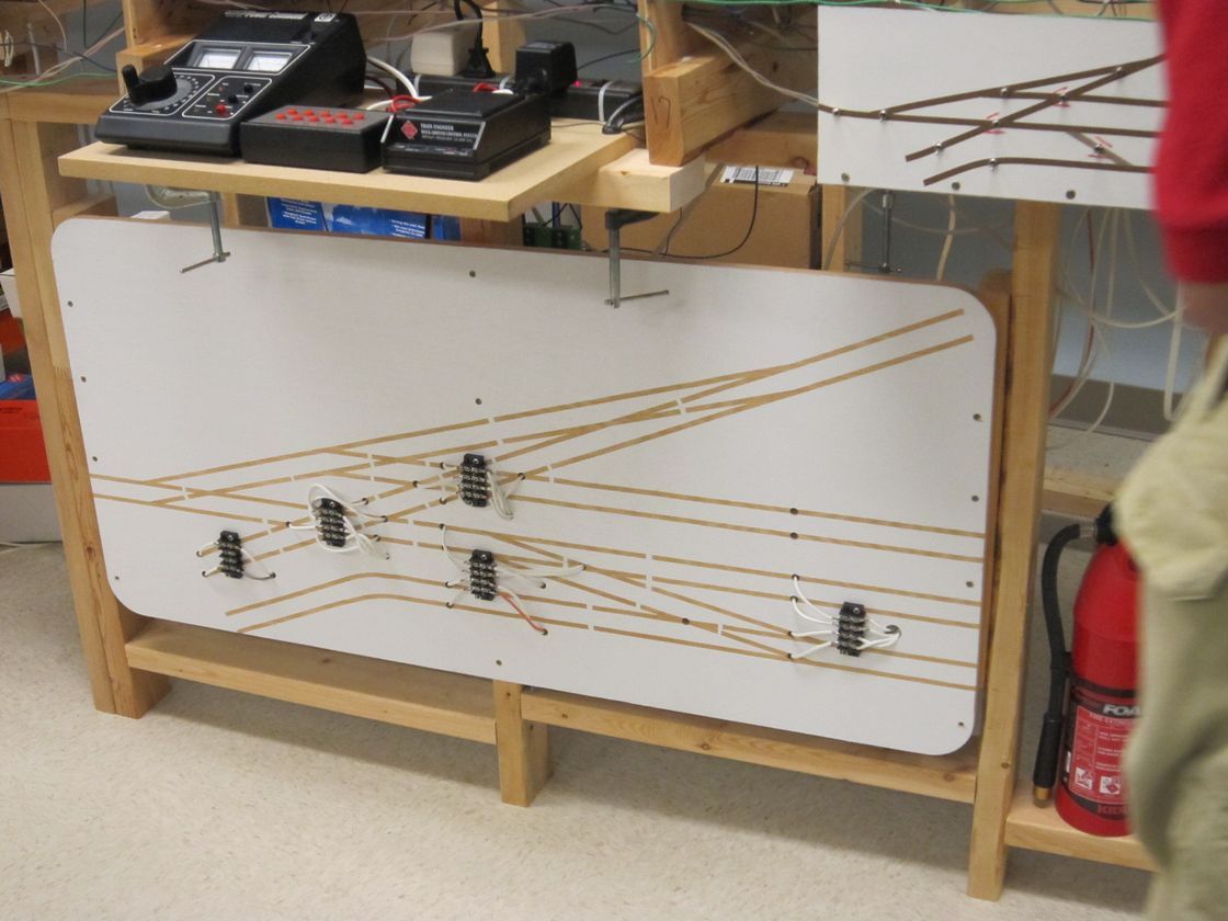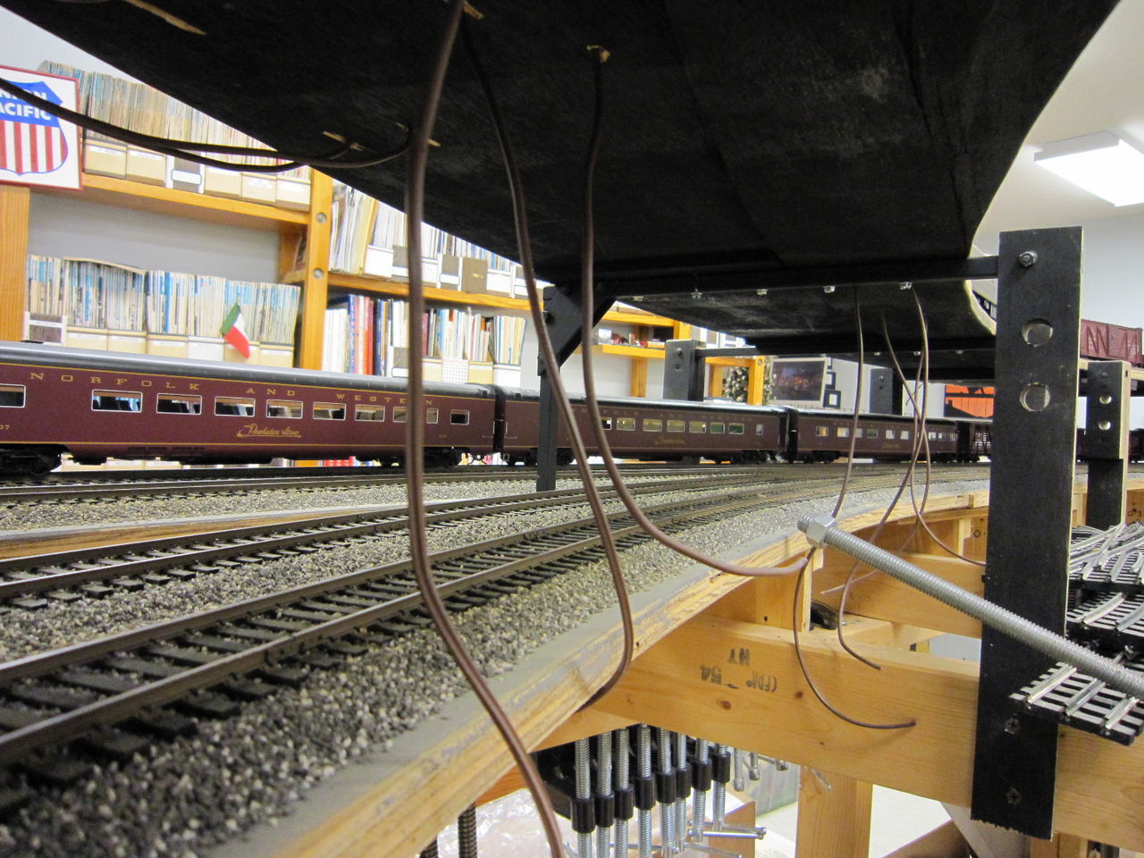 マイクはまだDCCに踏み切っていない。これについては皆に散々に言われている。「いずれ…」とは言っているが、まだその気配がない。乗り込んで行って、強制的にやるしかないだろうと思っている。DC方式では、交差部の配線がややこしい。この裏側の線は気が滅入るほど大変だ。