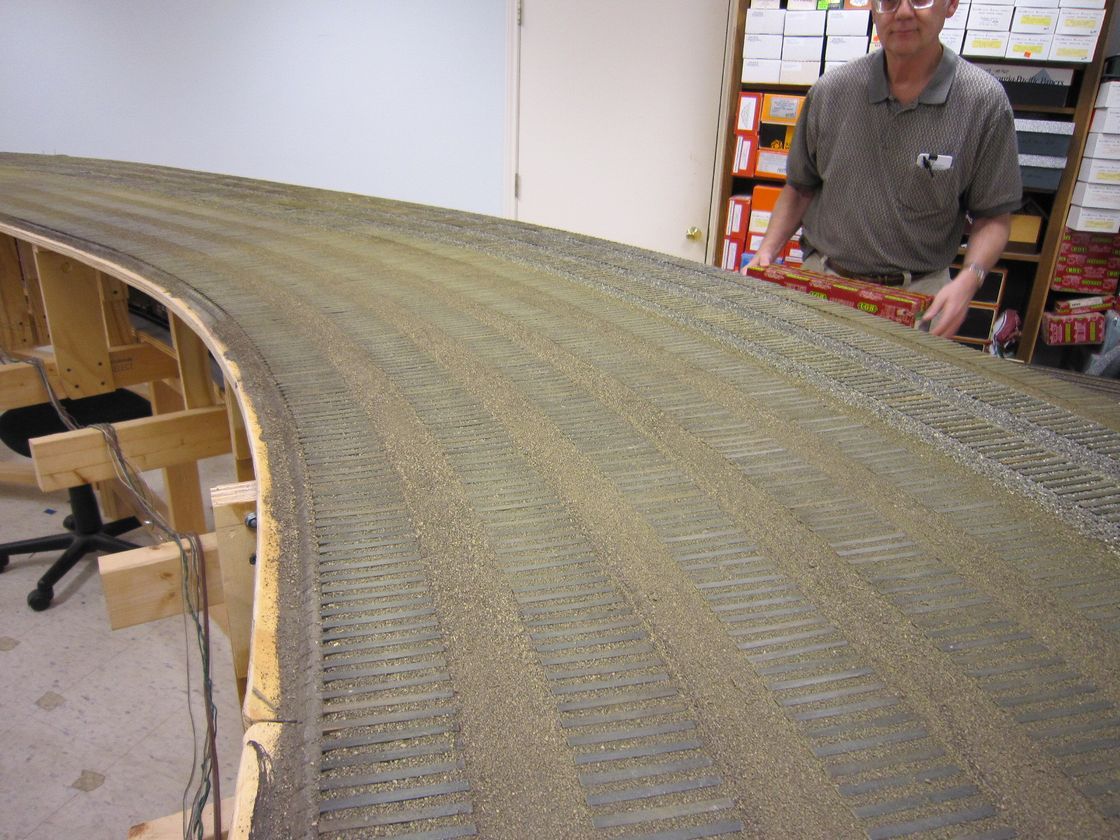 線路は全て計算通りに敷かれる。適当に路盤を作ってぺたぺたというのとは違い、座標通りに路盤を建設する。カントは全て路盤に付ける。床はポリ塩化ビニルのタイルである。それは1フート角であるから、それを碁盤の目として活用する。曲線の中心はこのような道具で位置決めをする。