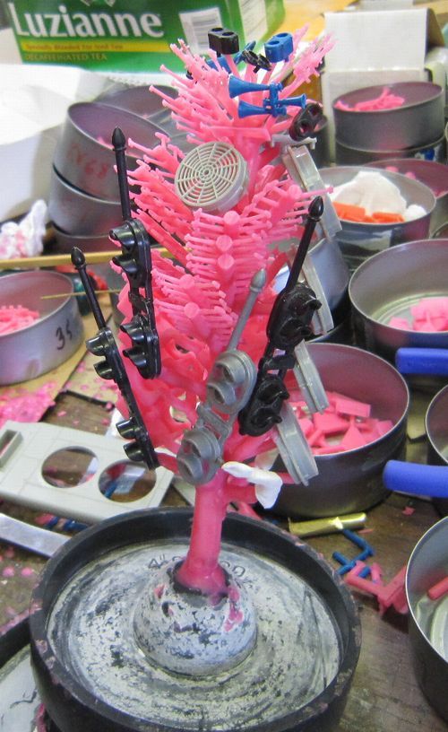 これは千手観音のように沢山のパーツを付けたツリィである。フラスコに入れてから、上から覗き、フラスコへの距離を保っているかどうかを確認する。左の写真の右下に付けてあるファン・ガードは湯流れが悪く失敗した。湯口からの深さが足らないので、圧力が掛からなかったのだろう。