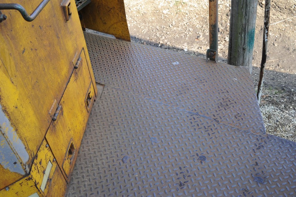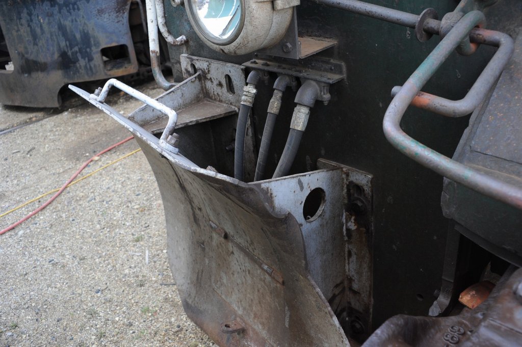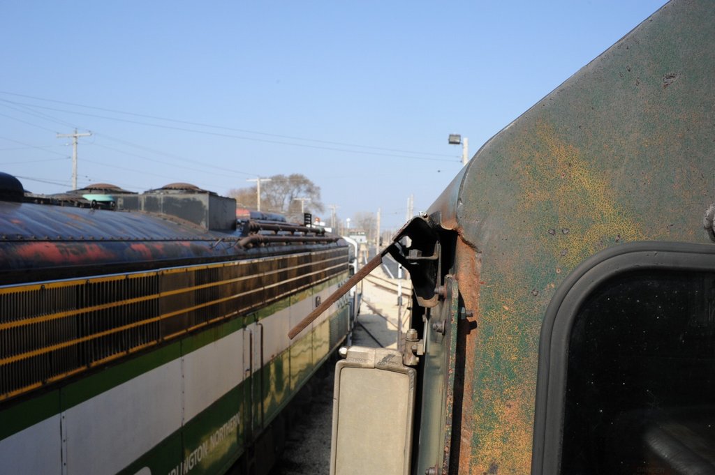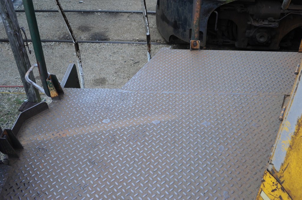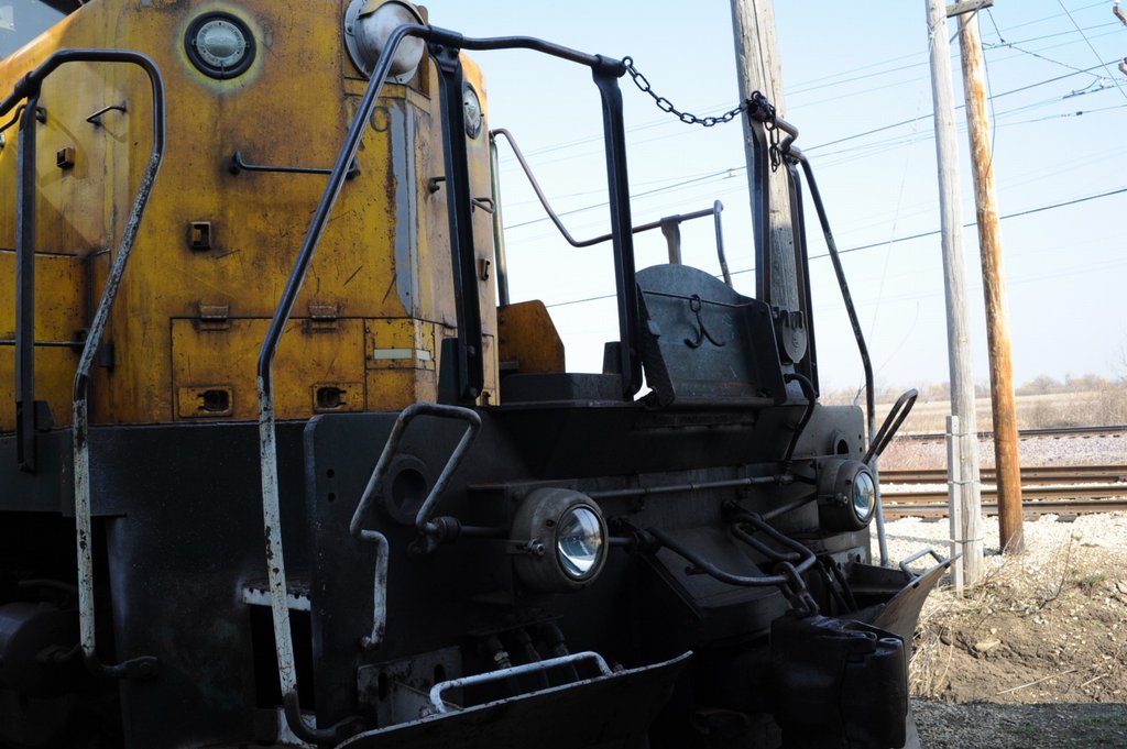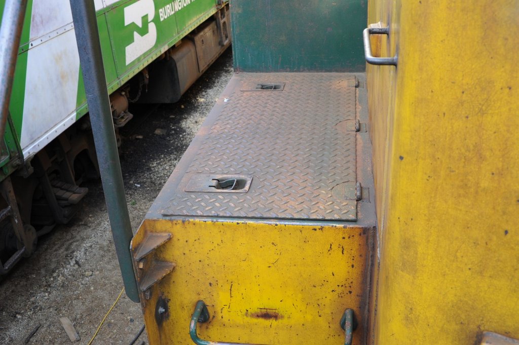 SD40-2のデッキ部分である。ステップの穴はプレスで作られている。穴は雪が抜けるようになっているのだ。突起があって、靴の底が確実に接触するようになっている。エンドの鋼鈑の厚さは1.5インチ(38 mm)もある。そこに、クレーンで吊り上げるときの穴があり、フックを掛けるときの保護用に円筒を熔接で付けてある。これは各鉄道会社の仕様に依るのだろう。