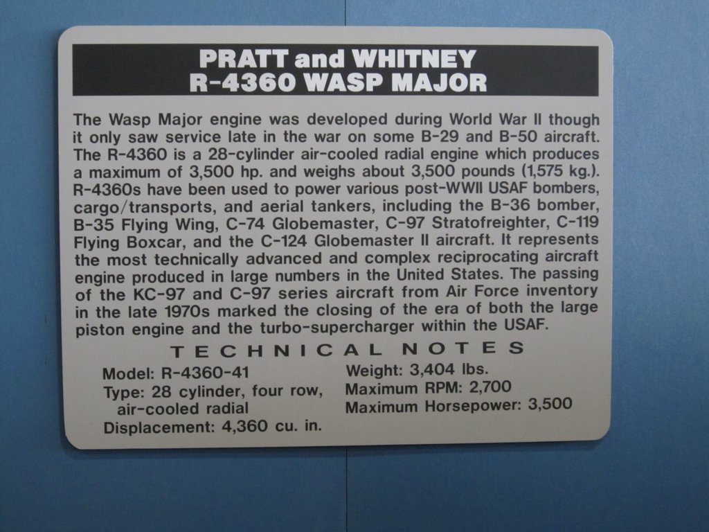 これはC-124グローブマスタである。4発の輸送機で、昔見たことがある。伊勢湾台風の時にアメリカから救援物資を積んできたのは、これだと記憶している。この飛行機もワスプ・メジャを搭載している。