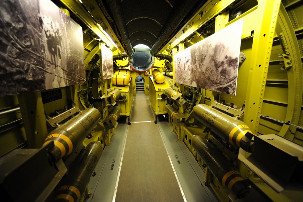 B-29の爆弾倉内部である、黄色がかった色であった。なんと言えば良いのかよく分からないが、Weyerhauser Greenに非常に近い色である。これは機体を加工して内部を歩けるようにしてあった。本当は上に見える円筒の中を搭乗員が這っていくのであるが、爆弾倉の中を歩けるように一部を切ってある。この機体の内部である。ノーズアートの展示も兼ねている。