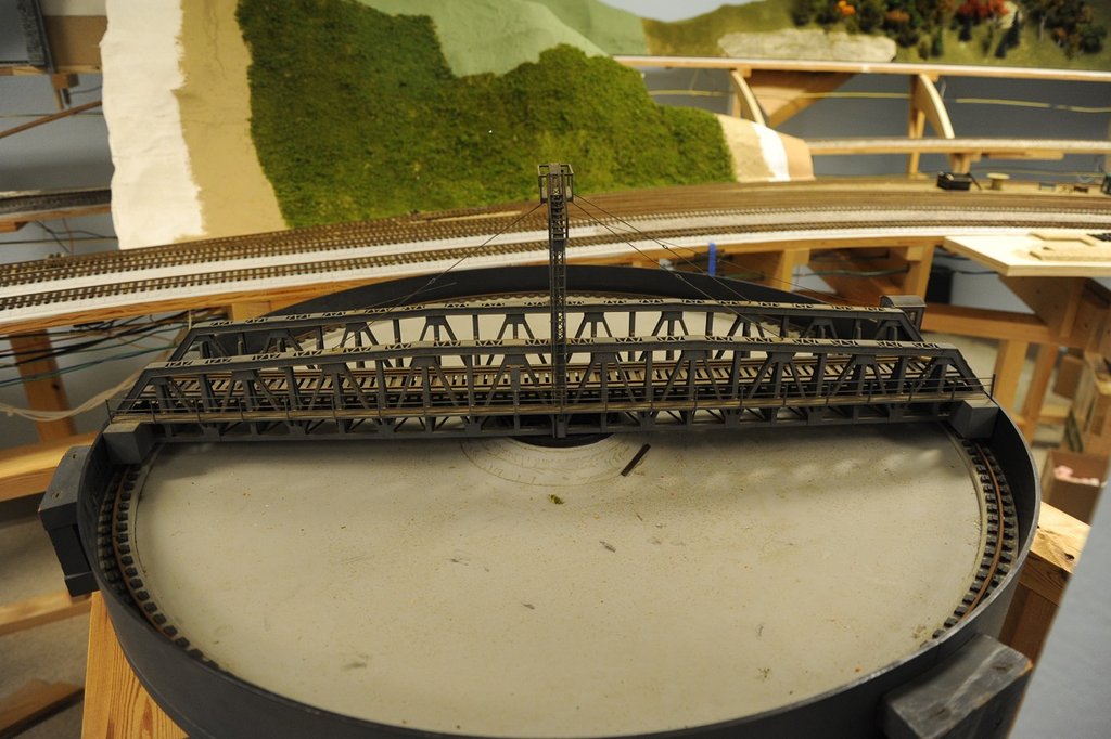 このターンテイブルは、フロリダのCLWの創業者のBob Smith氏のところにあったものらしい。もちろんスクラッチ・ビルトだ。それを譲ってもらってきて、30年ほどになると言う。このレイアウトに付けるつもりだ。中央のタワァから左右に出ているワイヤは、タワァ自身を安定させるもので、決して旋回橋を吊り上げているのではない。