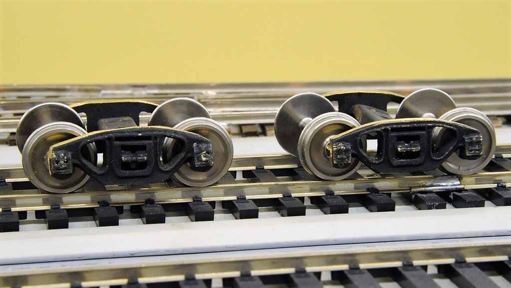 この貨車に付けてあるLobaugh製のAllied Full Cushion台車を長年探していた。e-bayで数年前に見つけて購入したものだ。手に取った瞬間、やる気が失せるほどひどいものであった。抜き勾配を削って孔をあけ、糸鋸で三角を切り抜く。凄まじい手間を掛けて、ここまで来た。元の文鎮のような鈍さが消えて、遠目には十分フルクッション台車に見えるようになった。 ピヴォット軸受を構成しようと思ったが、テーパ穴を作る工具の切れ味が悪くあきらめた。テフロン・コーティングの樹脂製スリーブも入れてみたが、それほど感心しなかった。残るはボールベアリングである。この貨車は台車を含めるとかなり重く、460 gほどある。軸重100 gを超えるとボールベアリングの効果が目に見えるようになる。 早速、座繰りドリルで孔を拡げ、装着した。