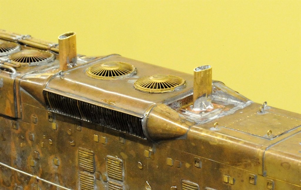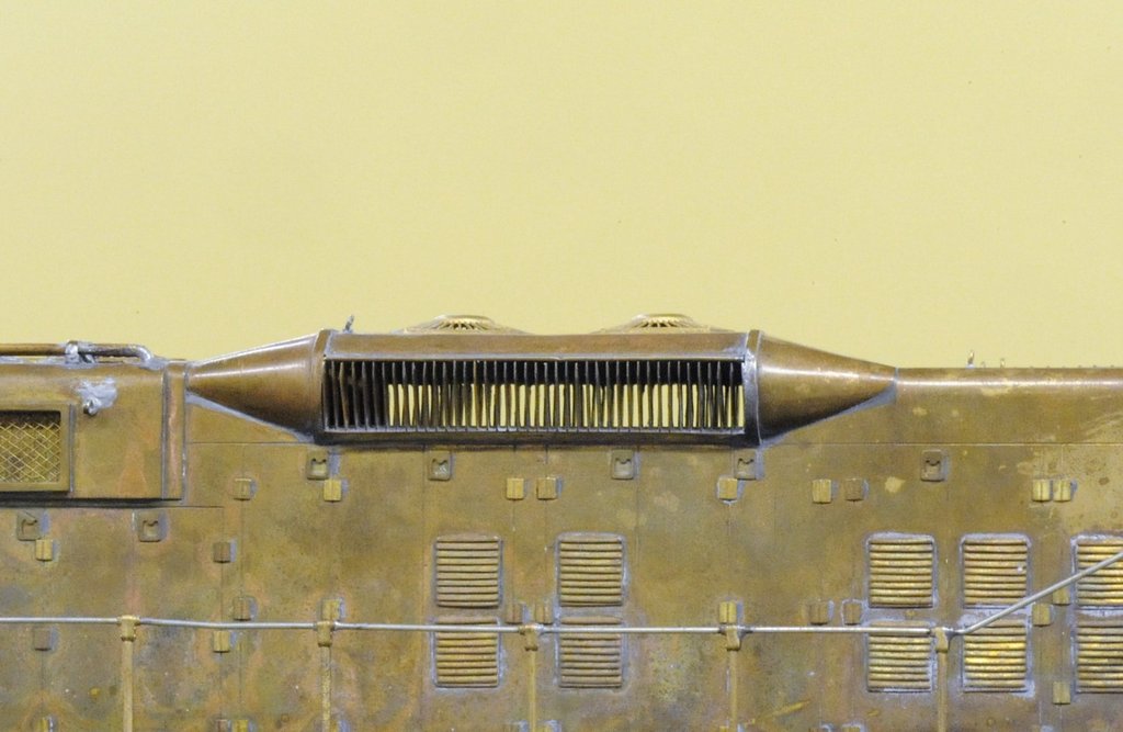 筆者としては看過できない間違いがあった。ダイナミック・ブレーキのブリスタ(膨らみ)の、内側の造形である。本物は凹んでいるのに、資料不足で、斜面を作ってしまったのだ。排気管の立っている場所が斜面だったのである。この種の修整はかなり手間が掛かる。切り抜いてL字型の板を張り、左右に隙間がないように三角の板を嵌める。この写真は修整後のものである。排気管は延長型に作り替えた。この仕事は伊藤 剛氏に手ほどきを受けた。