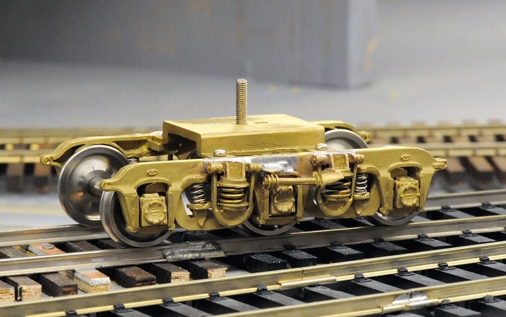 UPの流線形特急列車の荷物車、郵便車は重いので3軸台車が使われている。その製品を、アマチュアが作って売っていた。20年ほど前に見たのは、イコライズはするものの、構造をわかっていない人が作っていたので全く良くなく、一つ入手したがさらに欲しいとは思わなかった。これはテキサスのDennisが作ったもので、なかなか良い形をしている。構造を理解している人が簡略化しているからだ。既製品の2軸台車を切り継ぎ、新製した部品と組合せている。ハンダが多そうに見えるが、実はこれくらいがちょうど良く、鋳物のすその部分が表面張力でうまく表現できる。大きなコテで、多めのハンダを付けた。