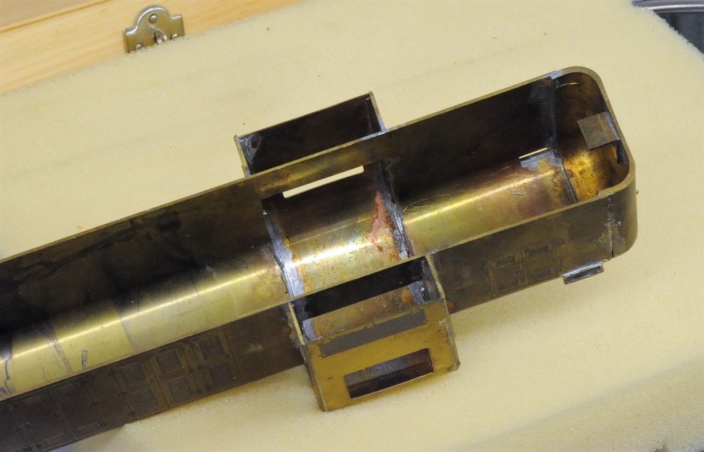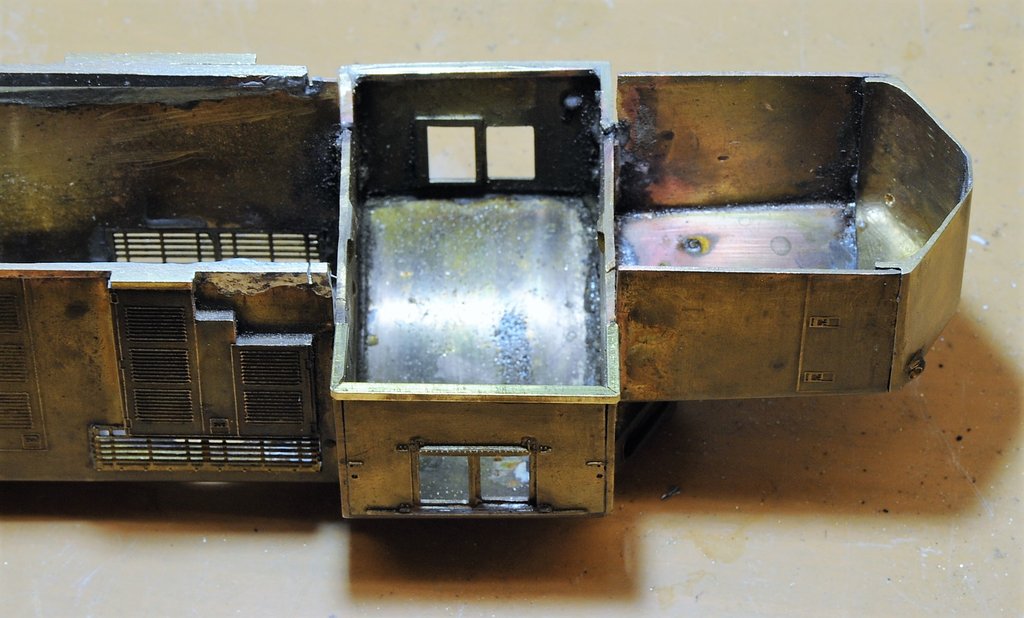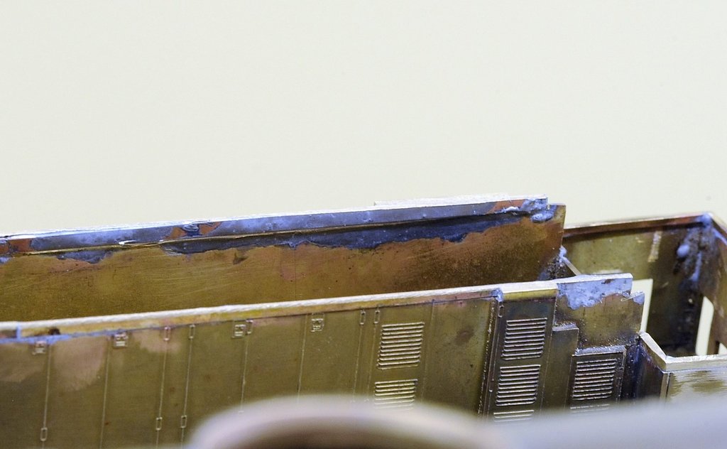 組んだ人はフッドの下端の不揃いをベルトサンダで落としたのだろう。ベルトサンダの削り速度は非常に速い。うっかりよそ見をしたか、人と話しながらやってしまったのだろう。あっという間に削りすぎて、後ろに傾いた。ショートフッドが浮いたのでハンダ付けをずらしてゴマ化した。それでもキャブが当たるので削ってしまった。というのが想像できる顛末である。このケムトロンのキットは1.01 mm(40ミル)のブラス板に深くエッチングしてあり、とても堅く重い。筆者の好きなキットである。ハンダ付けは細いガスバーナで行うと全面ハンダ付けができる。写真はキャブ下に2 mmの角線を貼り付けた状態である。これを削って修整する。