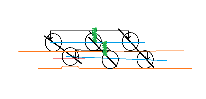 要するにイコライズしている2軸の中間にバネで圧着する中間軸を付けるのだ。この場合のバネの強さは事前に実験して決める。予定では、このプルマンの軸重は約200 gwだ。台車の質量が約170 gだから、バネだけで台車+30 gの分銅を支えなければならない。あとは自然に分配される。