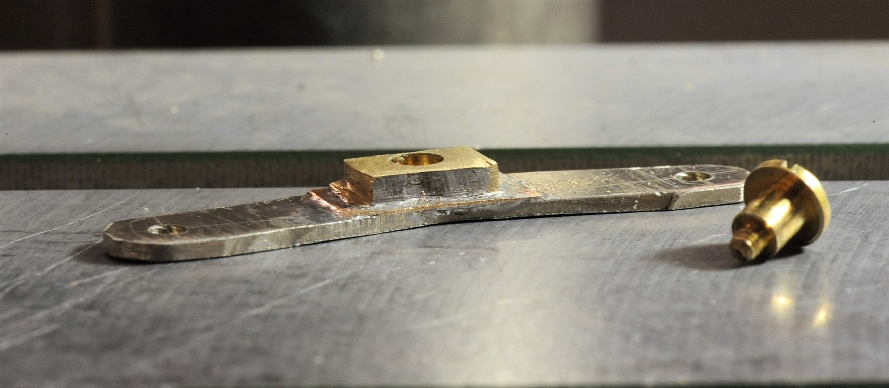 この軸は長めの段付きネジだが、相手と良く擦り合わせて、ガタが全くないように作り、モリブデン・グリスを少量塗っておく。厚板にはリーマを通し、油目ヤスリで調整した。潤滑脂を付けてぬるりと入るよう (snug fit) にする必要がある。 この手の工作は得意である。本来は台車は2点支持にすべきだが、段付きネジの数を節約するために3点支持にした。要するに、片方はハンダ付けするのだ。捻られる角度が小さいので、全く問題ない。