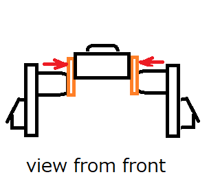前後軸を、ひっかかりなくイコライズするというのは意外と難しい。今まで、ほとんどのアメリカ人は何も考えずに組んでしまったのだろうが、この写真をご覧戴くと問題点がお分かりだろう。支点(赤矢印)が荷重の掛かる部分のかなり内側にある。これではまずい。すなわち、軸には回転力以外に、コジる力が掛かっている。摩擦を最小限にする工夫が必要だ。橙色の部品には厚板を貼り合わせて、段付きネジの円筒部と同じ長さの摺動回転部を作った。こうすればコジる力が働いても、平気である。