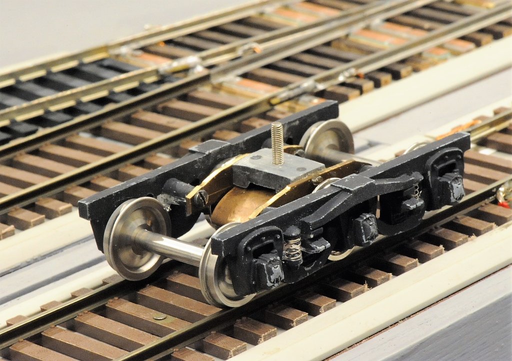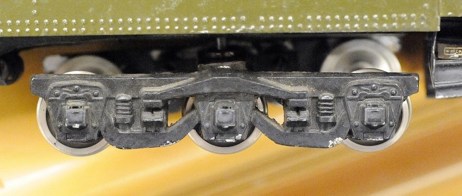 これはUS Hobbies (KTM製造)が出していた細密構造のダイキャスト台車である。揺れ枕まで動く凝った作りだが、車輪が亜鉛鋳物で話にならない。スケールを間違えているような気もする。大きいのだ。1/45.2かもしれない。しかし、「これでも正しい」という人もいる。大きい台車もあったと言うのだ。真偽は分からぬ。