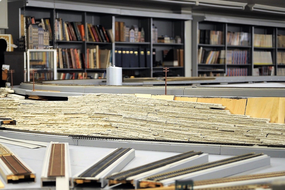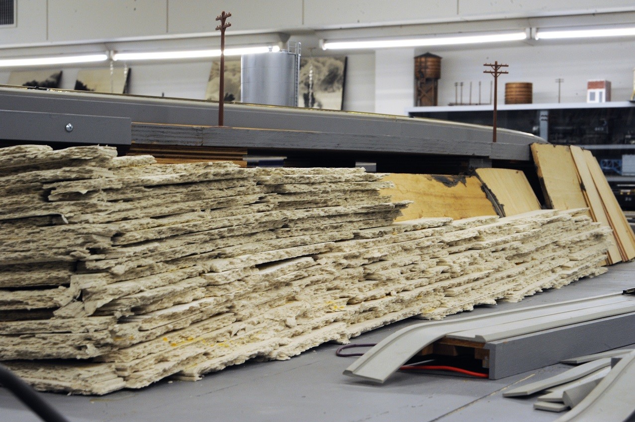 博物館のレイアウトは少しずつ進捗している。今、崖の部分の堆積岩を作っている。地層が傾いているのがミソである。こうすると実感的である。隙間があるが、それはあとで埋める。