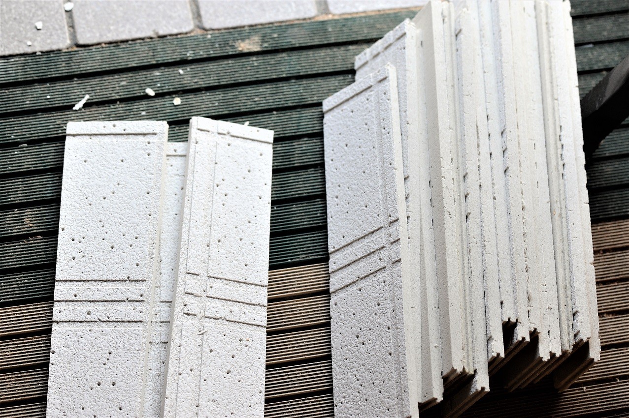 それを 7 cm程度の幅に切り、半分に割って切り口を露出させる。表面は多少人工的であるので、下を向けて見えないように積む。