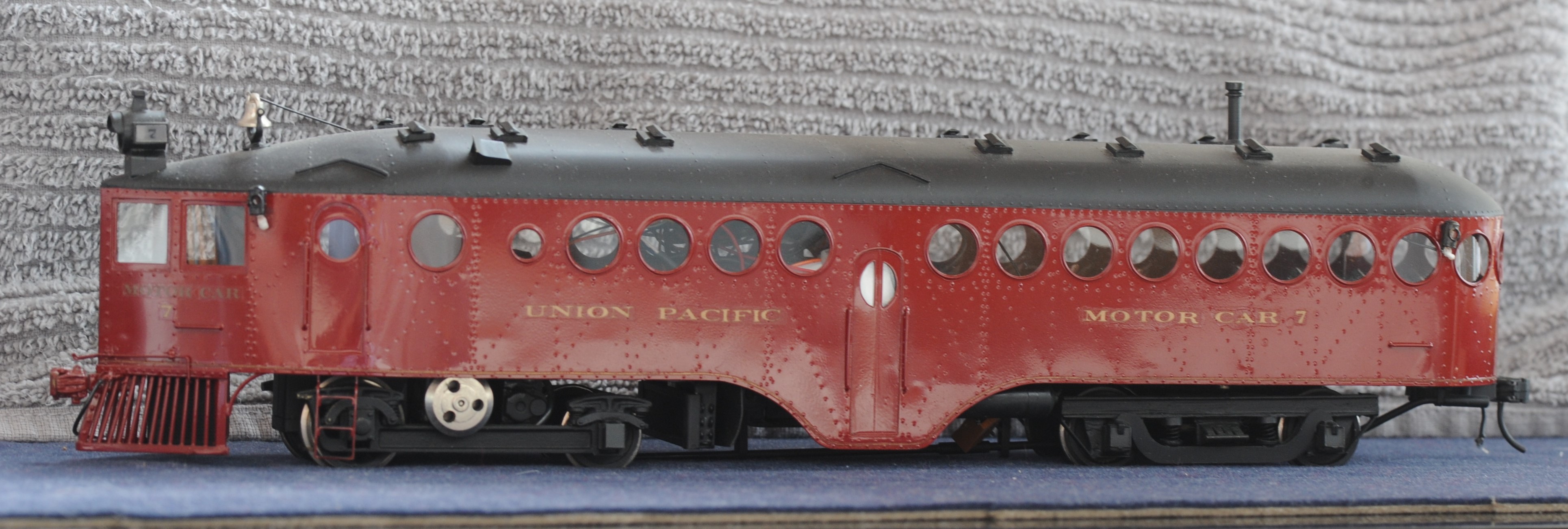 この McKeen の屋根は叩き出して作ってあり、そのすべての面にリヴェットが打ち出してある。なかなか難しい細工である。また、窓は糸鋸で切り抜いてあり、曲げた真鍮線の縁取りが付いている。現在はDCC化してあり、内部には3つのデコーダが載っている。走行、はずみ車、音声用である。マーカーライトには小型電球を入れたが、現在のLEDを使えば、もう少しうまくまとめられる。更新が必要だ。