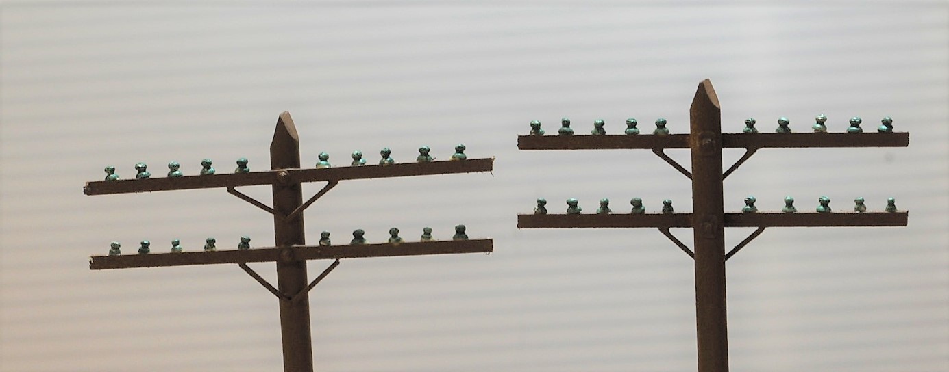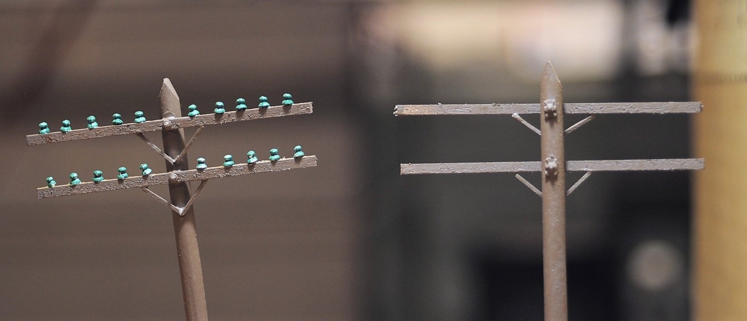 碍子はガラス製だ。無色のと緑色とがある。塗装後に水性接着剤で付けた。触らなければ落ちることはない。この接着剤はアメリカで買ったもので、硬化後は水に溶けなくなる。拡大すると粗が目立つが、普通の鑑賞距離ではそれらしく見える。