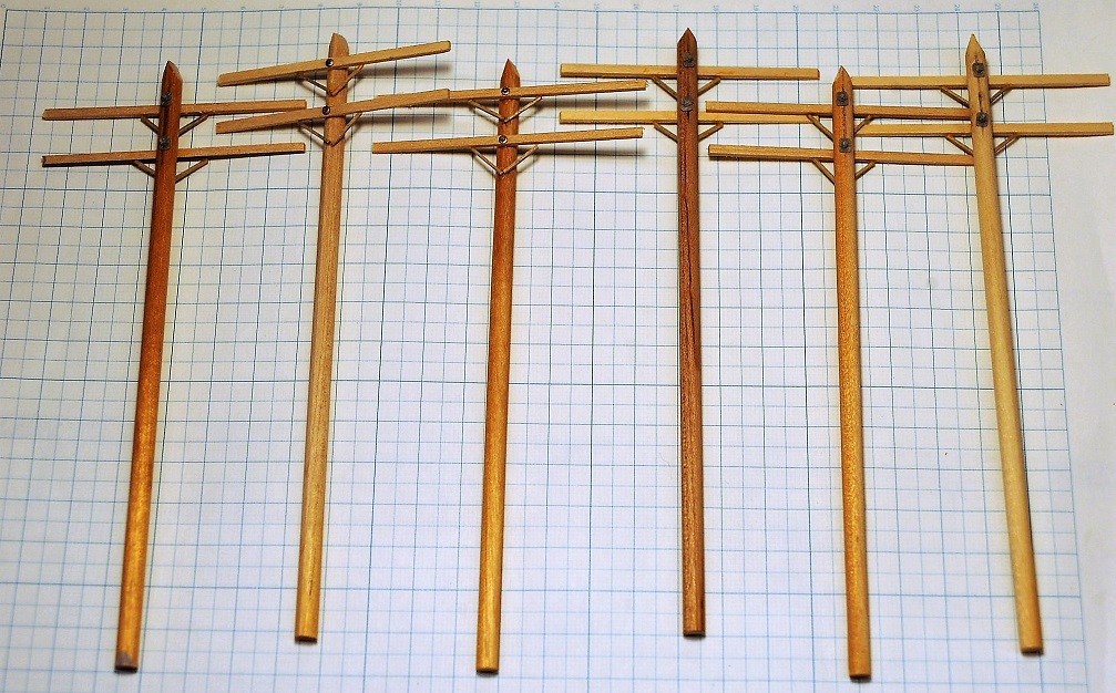 その中で電柱(信号線)のいくつかの例があった。材料は丸棒と角材である。それとNBW (nut, bolt, washer) もあると良い。NBWのロストワックス鋳物は最近どっさり発見された。丸棒は白木の箸を電気ドリルに銜え、サンドペーパで細くした。角材は薄板から挽き出した。図面通りにしたら、かなり細い。そのままオイルステインに短時間浸け、乾かした。こうすると表面に膜ができて、上塗り塗料を節約できる。