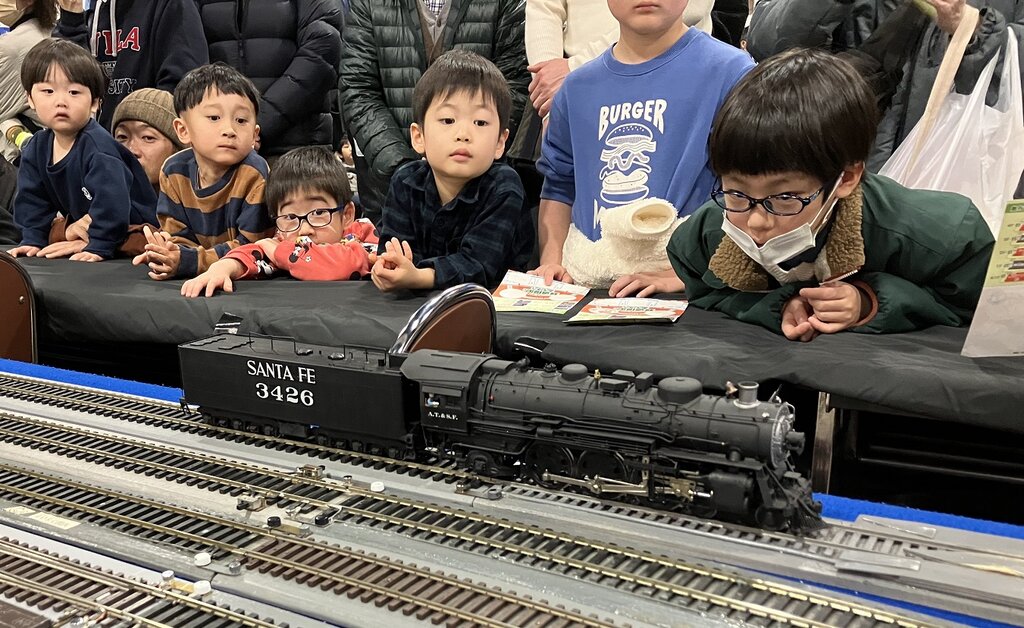 運転は意外と難しく、逆電圧をどの程度掛けるとロックし、もう少し上げて逆回転というあんばいが分かるまでは失敗の連続だ。レイルとの相性もある。自宅、博物館での鋼レイル上では習熟しているが、この会場では、摩擦係数のより小さい洋白レイルであったことも、難しさを大きくしていた。1時間も経つとコツが分かり、うまくロックさせたり逆回転ブレーキを披露することができた。逆回転はマンガ的な動きに見えるらしく、子どもたちには人気があった。SNSには動画がupされているが、当初の練習中の風景で、完全なロック状態や、逆回転ブレーキが再現されているわけではない。もう少し後で撮影したものを使った方が良かった。いずれ更新されるであろう。