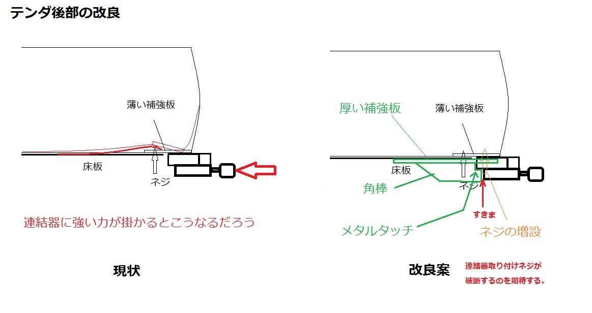 テンダの連結器も上廻りに付いている。本来は外して下廻りに付け替えたいのだが、かなり面倒な工作になるので、思い切って、メタルタッチ方式にして、床板を補強することにした。衝突時の力は床板に取り付けた角材に伝わる。しかし床板が弱いと、それが曲がって、上廻りの変形を許してしまうことになる。