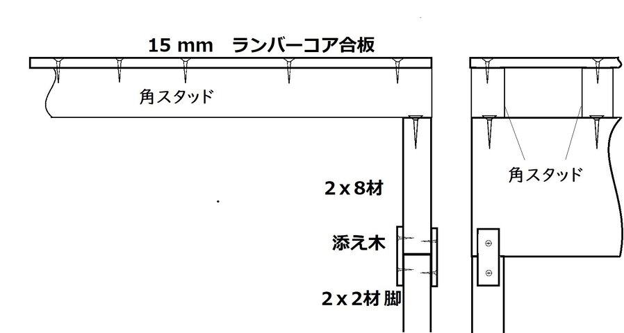 普通のレイアウトなら、撓みが生じないように2x8材を立てて水平に置き、その上に直角に角スタッドをコース・スレッドで留めれば出来上がりだ。足は2x2材で十分だ。甲板のランバーコアは、角スタッドに直接コーススレッドで留める。こうすれば、非常に堅固な路盤が出来る。甲板の継ぎ目には裏から継ぎ目板補強の合板を接着剤とコーススレッドで貼ると丈夫になる。角スタッドのスパンは 90 cm程度にすると角スタッドの敷設密度が減らせる。