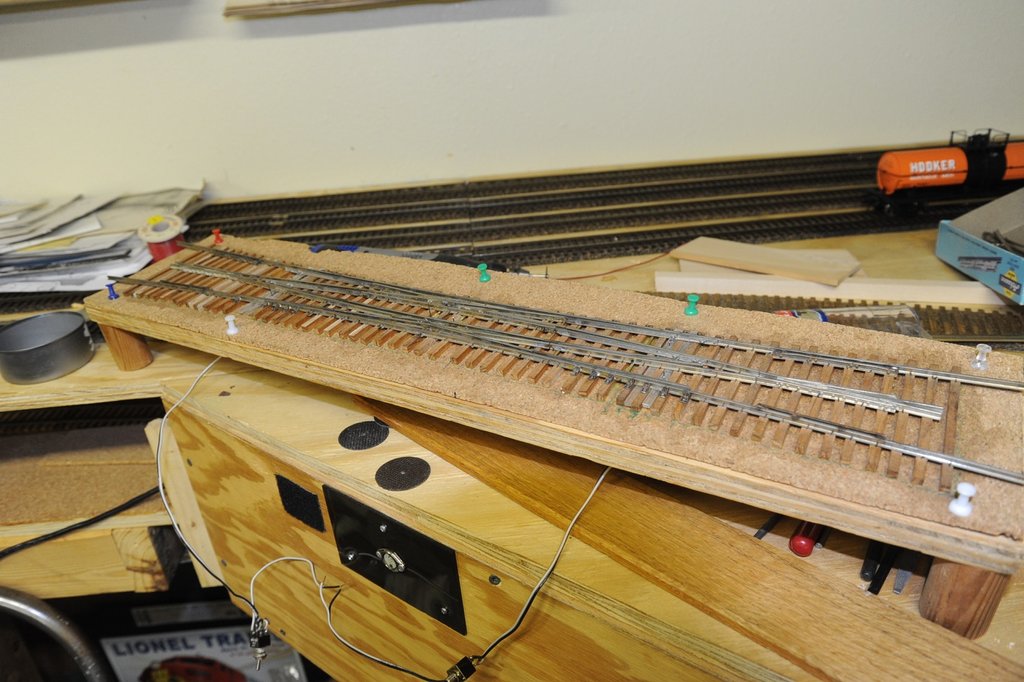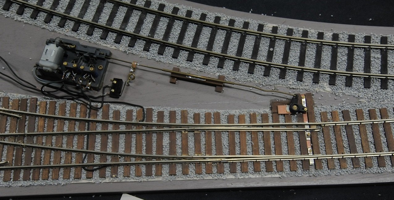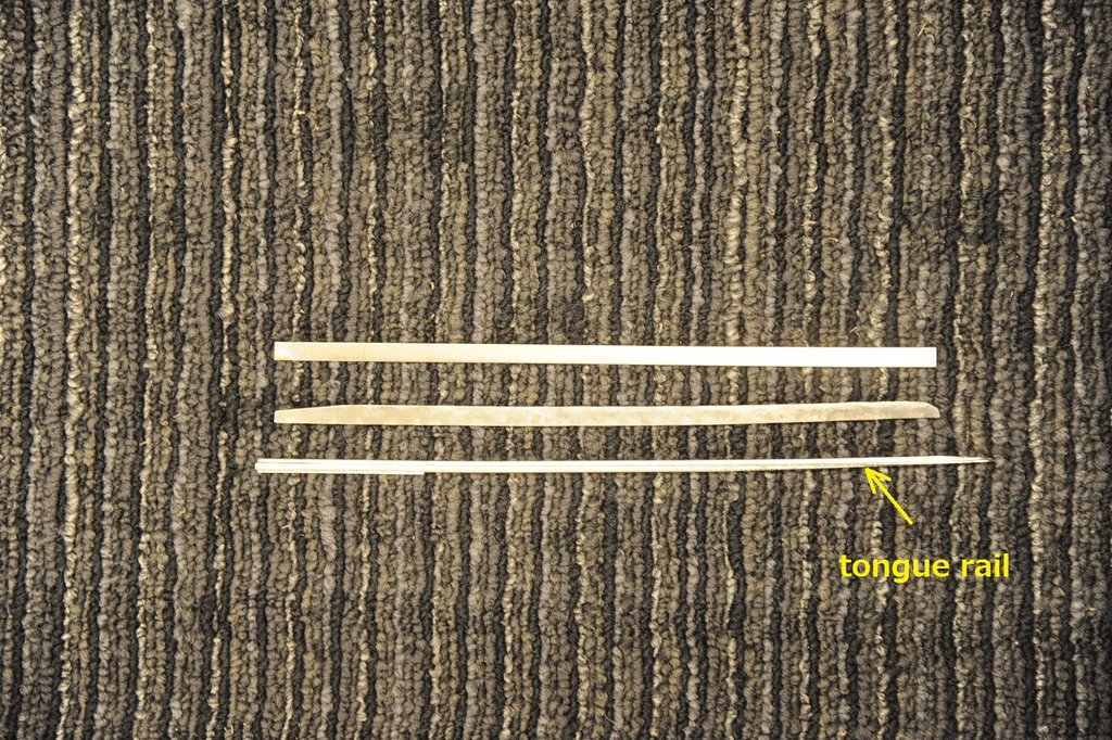 ストックレイル(尖端レイルが接触する部分)は僅かに削り込んで、尖端レイルの先がはまりこむようにした。こうすれば脱線の可能性が大幅に減る。