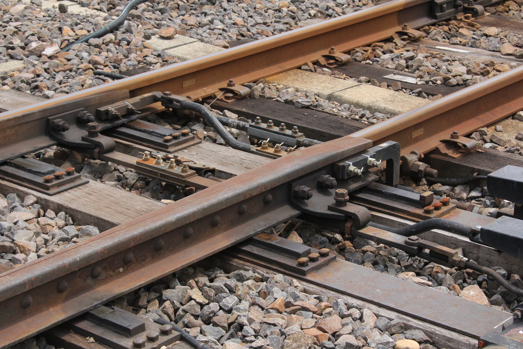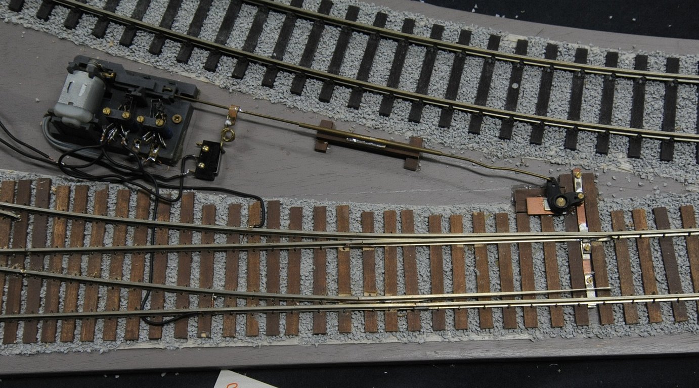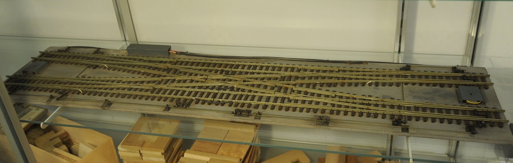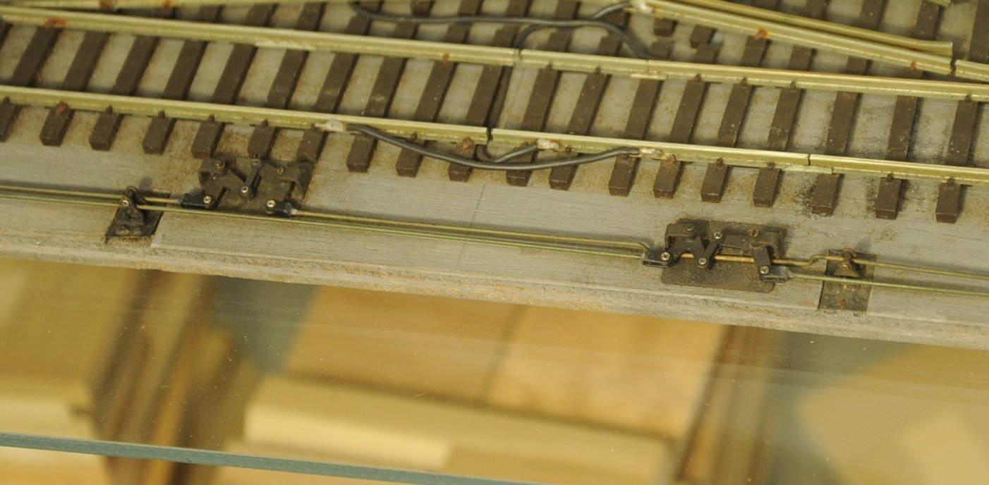 ダブルスリップの中央のフログを可動にしている。完全に密着させるのにイコライザを使用せず、バネを使っている。二組の尖端レイルを動かすのに絶縁用のプラスチック板に切れ目を入れ、同時に動かしている。実にうまく作動するので感心して見ていた。