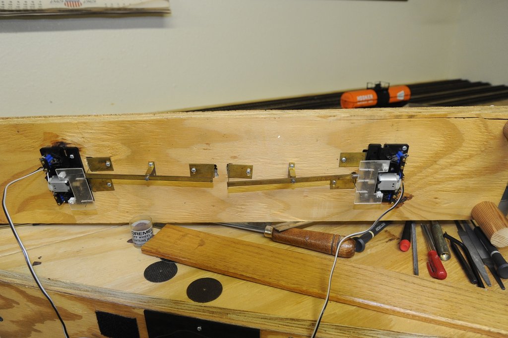 分岐の間にポイント・マシンをおくことにして、直角に動きを変えたのだ。クランクを1つ作って、長いロッドで操作する。ロッドが座屈するのを防ぐために、中間を受けた。