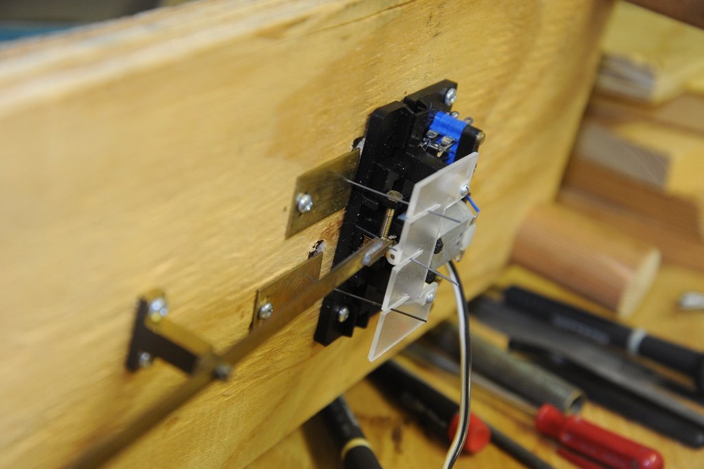 レマコの接点は使うべきでないと判断し、ポイントマシンからの駆動ロッドの途中に角を出して、マイクロ・スウィッチを押すようにした。信頼性のある方法である。しかも押すとつながる方向にした。離れるとつながるようにすると、故障した時、事故を起こす。