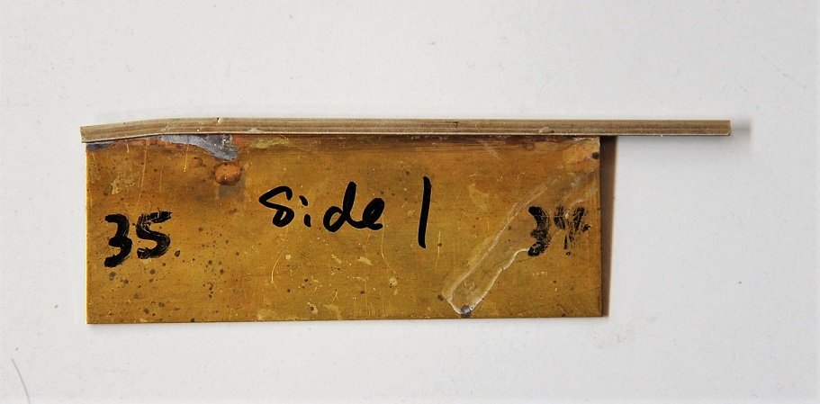レイルを斜めに保持するのだが、下から支える工夫が必要である。適当なブラスの板を斜めに切ってレイルの溝にはさみ、両端を軽くハンダ付けする。そしてレイルを万力に銜えて削る。簡単な作業である。要するに斜めの正直板である。こういうのは正直板とは言わないのだろうか。
