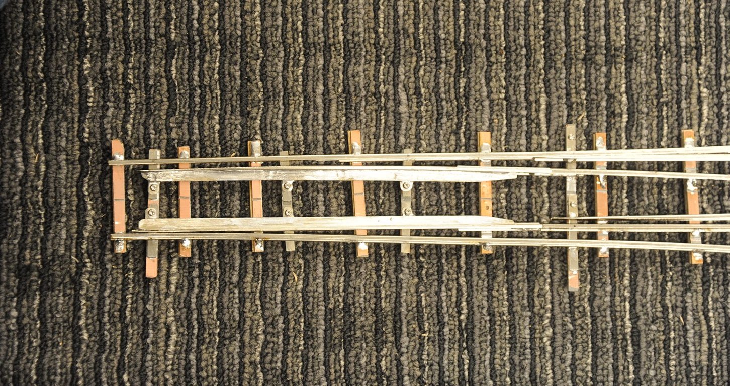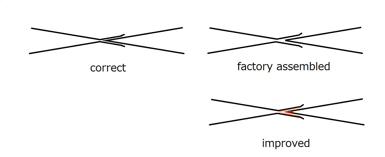 しかしそれでは接触していない(車輪が通過しない)尖端レイルには、その近傍のストックレイルと逆極性の電気が来ていて、ショートの危険が増す。NMRAの規格は30年ほど前更新されている。以前は、この逆極性の時も尖端レイルとストック・レイルとの近接を認めていたが、突然改訂され、離す量を大きくするように要求してきた。理屈はそれでよいのだが、実物より離れる量が大きいのであまり恰好が良いとは言えなかったのだ。
