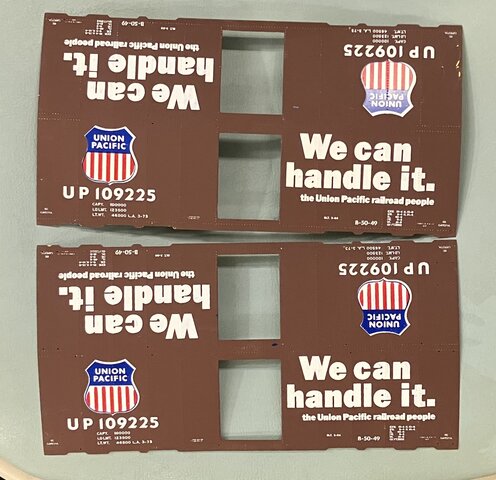 戦後すぐはコカコーラの空き缶の裏に塗装して文字等を印刷して売っていた。次はアメリカ製の 0.25 mm(1/100 インチ)ブラス板にリヴェットを打ち出し、塗装して売った。そのうちに、日本にブラス製のプレスした側板を注文すれば安上がりだと気が付いた。安達製作所製で、板厚は0.30 mmになった。多少厚くなって安心できる。その模型は木製箱( 約 4 mm厚)に外板を張るようになっていたので、木部に剛性を負担させ、わしづかみで持てたのだ。金属板だけではめり込む可能性があり、不安である。さて、この写真を見て戴きたい。UPのヘラルドがシルクスクリーンの印刷ズレでおかしくなっている。こういう失敗作を10枚ほど、安く手に入れた。剥がしてしまって別の会社にしてしまったものもある。2枚一組になっているので、半分に切り離すのだ。あるいはヘラルド部分だけをうまく剥がしたりして平滑にすれば、新しいディカールを貼れるだろう。