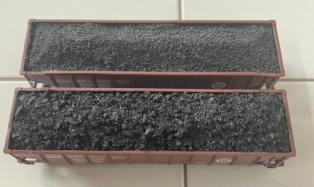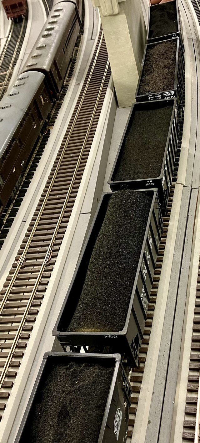 隙間にさらに接着剤を付けて石炭クズを押し込み、全体が不自然な形にならないようにする。大事なのは安息角を保つようにすることだ。アメリカの石炭は細かくしたものを積んでいる場合がほとんどだ。イギリスでは塊が積んである場合がある。