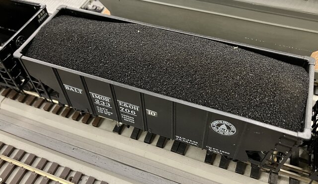 スポンジの石炭はこんな具合だ。撓ませた状態で大きさを決め、押し込んで収まり具合を見る。軽く押して嵌まるようならOKだ。右側はやや低い。何かを詰めて持ち上げねばならない。わずかに中心部が膨らむことを確認する。スプレイの黒を十分に吹き、乾燥させる。大きさの変化は少ない。